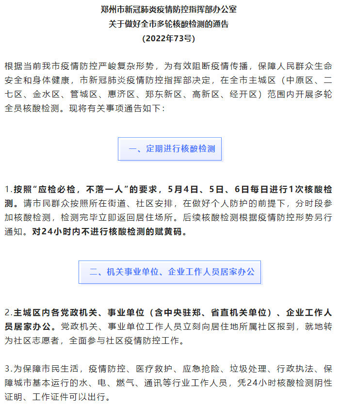 鄭州市新冠肺炎疫情防控指揮部辦公室發(fā)布73號(hào)通告,要求主城區(qū)內(nèi)各黨政機(jī)關(guān)、事業(yè)單位(含中央駐鄭、省直機(jī)關(guān)單位)、企業(yè)工作人員居家辦公。除保障市民生活和城市基本運(yùn)行的公共服務(wù)類企業(yè)、經(jīng)審批符合閉環(huán)管理?xiàng)l件的企業(yè)外,其他各類企業(yè)暫停生產(chǎn)經(jīng)營(yíng)活動(dòng)。