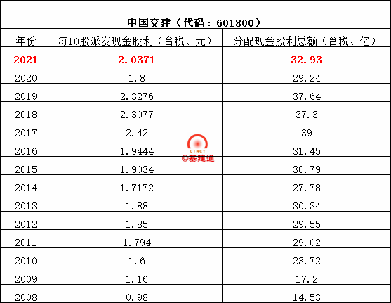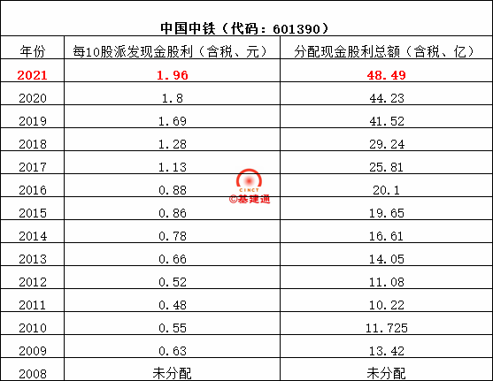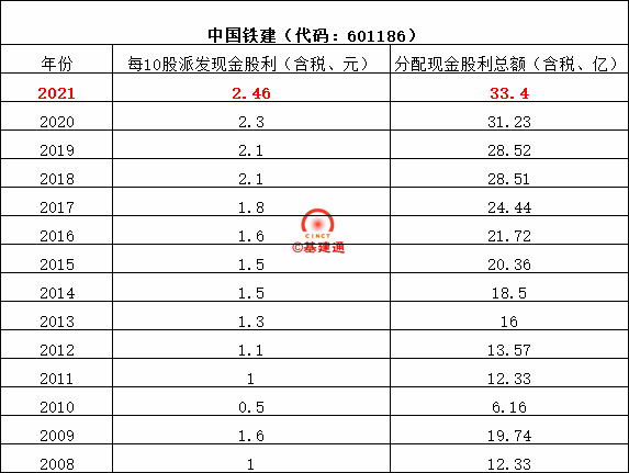 中國鐵建以2021年12月31日公司總股本13579541500股為基數(shù),每10股派送現(xiàn)金紅利2.46元(含稅),共計分配利潤33.4億元,占當年合并報表歸屬于上市公司普通股股東可供分配利潤的15.37%。