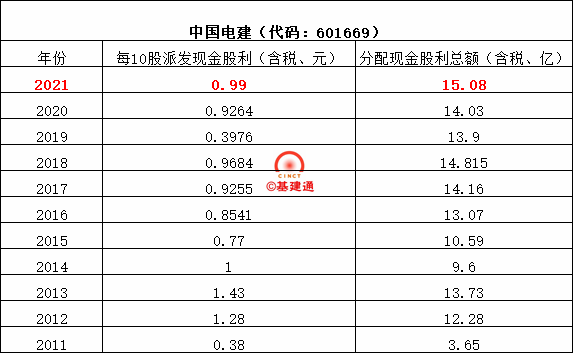 中國電建2021年度以期末總股本15299035024股,扣除回購專戶股份152999901股為基數(shù),向全體股東每10股派發(fā)現(xiàn)金紅利0.9957元(含稅),共計分配現(xiàn)金股利15.08億元,占本年度末母公司可供股東分配利潤的28.57%,占本年度合并會計報表歸屬于上市公司普通股股東凈利潤的20%。