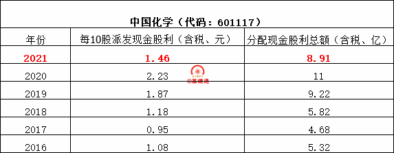 中國化學(xué)擬以2021年12月31日總股數(shù)6109470588股為基數(shù),向全體股東每10股派1.46元(含稅)現(xiàn)金股息,共派發(fā)現(xiàn)金股利8.91億元,擬分配的現(xiàn)金股息總額與當年歸屬于上市公司股東的凈利潤之比為20.01%。