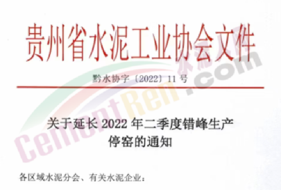 貴州省水泥工業(yè)協(xié)會(huì)發(fā)布《關(guān)于延長(zhǎng)2022年二季度錯(cuò)峰生產(chǎn)停窯的通知》要求貴州區(qū)域所有水泥熟料生產(chǎn)線二季度每條生產(chǎn)線精準(zhǔn)錯(cuò)峰生產(chǎn)共計(jì)45天。