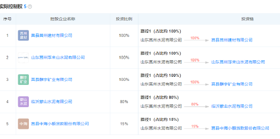 企業(yè)對外投資五家企業(yè),其中莒縣麒宇礦業(yè)有限公司、莒縣中海小額貸款股份有限公司、山東莒州浮來山水泥有限公司、莒縣建材有限公司四家尚在正常營業(yè)。企業(yè)對莒縣麒宇礦業(yè)有限公司、山東莒州浮來山水泥有限公司、莒縣建材有限公司為100%控股,莒縣中海小額貸款股份有限公司持股15%。