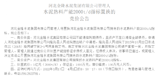 2月26日,河北金隆水泥集團有限公司管理人發(fā)布《水泥熟料產(chǎn)能2000t/d指標置換的競價公告》提到,河北金降隆水泥集團有限公司因不能清償?shù)狡趥鶆?wù),且資產(chǎn)不足以清償全部債務(wù),申請人河北金隆水泥集團有限公司向隆堯縣人民法院提出破產(chǎn)申請后。隆堯縣人民法院于2015年10月22日依法作出(2015)隆民破字第2-1號民事裁定書,裁定受理河北金隆水泥集團有限公司破產(chǎn)重整一案,并指定管理人。管理人就通過競價公開處置產(chǎn)能指標征求債權(quán)人意見,經(jīng)債權(quán)人表決,該事項已通過。現(xiàn)管理人決定依法公開置換河北金隆水泥集團有限公司擁有的水泥熟料產(chǎn)能2000t/d指標。