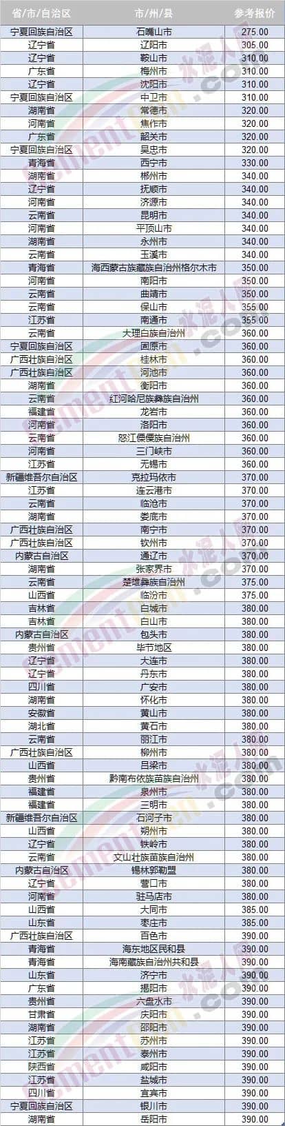 據(jù)水泥人網(wǎng)信息中心數(shù)據(jù),盡管多區(qū)域主要品牌企業(yè)報價大幅拉抬,但落地執(zhí)行價格仍相對較低,近期報價在400元/噸以下的區(qū)域包括寧夏、遼寧、廣東、河南、湖南、青海、云南、江蘇、福建、內(nèi)蒙、山西、四川、貴州、湖北、安徽、甘肅 、陜西等近二十個省份、自治區(qū)。寧夏石嘴山賽馬水泥P.O42.5散裝水泥參考報價已降至300元/噸以下,報275元/噸。