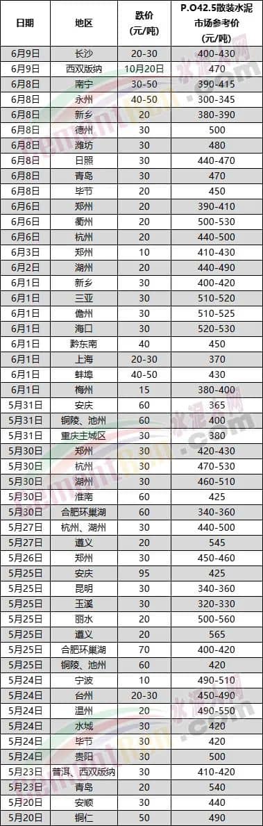 海螺水泥在現(xiàn)貨市場上的戰(zhàn)略調(diào)整對多個(gè)區(qū)域造成影響。長三角區(qū)域某企業(yè)銷售負(fù)責(zé)人對水泥人網(wǎng)表示, 近日,長三角沿江熟料價(jià)格持續(xù)下跌,6月7日前后再次下調(diào)30元/噸,離岸價(jià)報(bào)350元/噸左右。區(qū)域內(nèi)主要品牌企業(yè)“領(lǐng)跌”,自5月下旬以來,多地跌超100元/噸。其中,安慶區(qū)域5月下旬兩次下調(diào)水泥價(jià)格,累計(jì)跌價(jià)達(dá)155元/噸;合肥環(huán)巢湖區(qū)域兩次累計(jì)下跌130元/噸;銅陵、池州兩次累計(jì)下跌120元/噸。據(jù)市場反饋,近日江蘇“下江區(qū)域”、四川達(dá)州區(qū)域、湖南永州區(qū)域多家品牌企業(yè)“蘿卜蹲式降價(jià)”, 且區(qū)域內(nèi)包括海螺在內(nèi)的多家品牌企業(yè)均參與其中。市場上傳出“有海螺的地方就有水泥江湖”、“海螺和紅獅兩家低成本龍頭掰腕子啦!”、“海螺和金峰互不相讓,降10元/噸跟跌中”……當(dāng)然這其中不乏其他品牌企業(yè)的身影,甚至部分的粉磨站企業(yè)也參與其中。