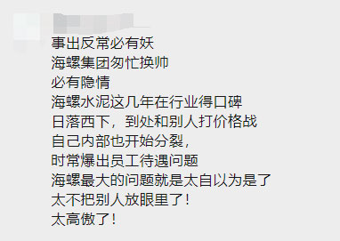王誠辭職時,就曾有網(wǎng)友表示,“作為世界500強,一般不會如此輕率換帥(接任不足一年),其中必有故事。”也有網(wǎng)友表示:“事出反常必有妖,海螺集團匆忙換帥必有隱情。”另有網(wǎng)友表示,“第一反應(yīng),腐敗了”。