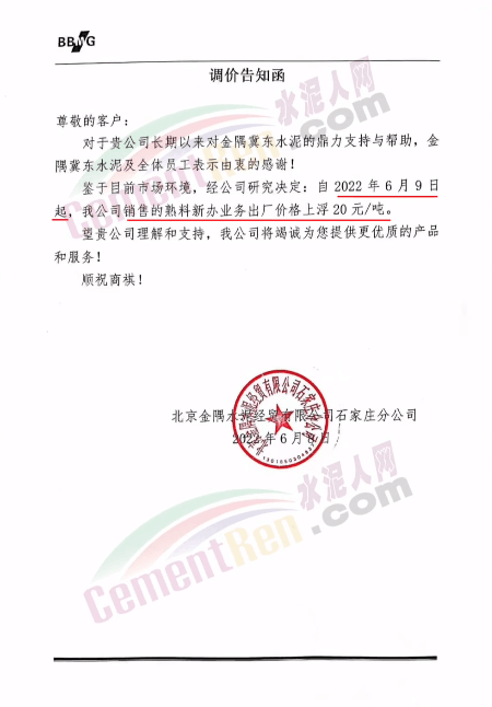 日前,北京金隅水泥經(jīng)貿(mào)有限公司石家莊分公司通知,鑒于目前市場(chǎng)環(huán)境,公司銷售的熟料新辦業(yè)務(wù)出廠價(jià)格上浮20元/噸。