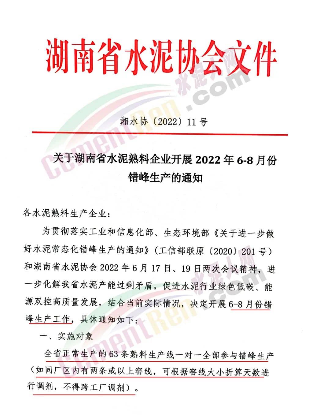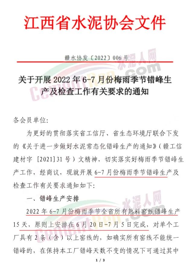 日前,湖南、江西兩省分別通知轄區(qū)內(nèi)所有水泥熟料企業(yè)執(zhí)行夏季錯(cuò)峰生產(chǎn)。湖南省通知稱,為進(jìn)一步化解水泥產(chǎn)能過剩矛盾,促進(jìn)水泥行業(yè)綠色低碳,能源雙控高質(zhì)量發(fā)展,結(jié)合當(dāng)前實(shí)際情況,決定開展6-8月份錯(cuò)峰生產(chǎn)工作。全省正常生產(chǎn)的63條熟料生產(chǎn)線一對(duì)一全部參與錯(cuò)峰生產(chǎn),如同廠區(qū)內(nèi)有兩條或以上窯線,可根據(jù)窯線大小折算天數(shù)進(jìn)行調(diào)劑,不得跨工廠調(diào)劑。