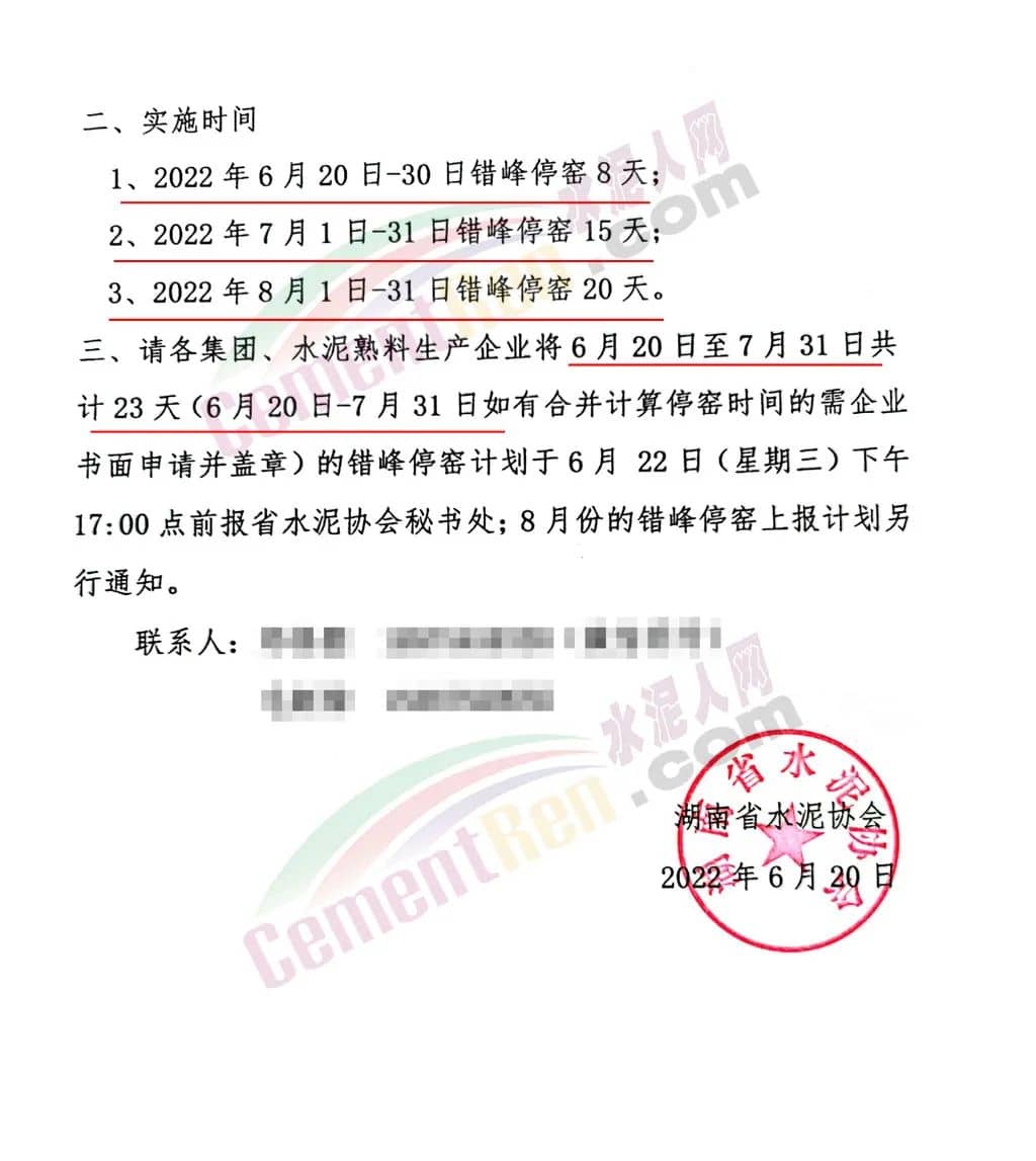 實(shí)施時(shí)間,6月20日~30日錯(cuò)峰停窯8天;7月1日~31日錯(cuò)峰停窯15天;8月1日至31錯(cuò)峰停窯20天,共停窯43天。其中6月20日到7月31日,共停23天。