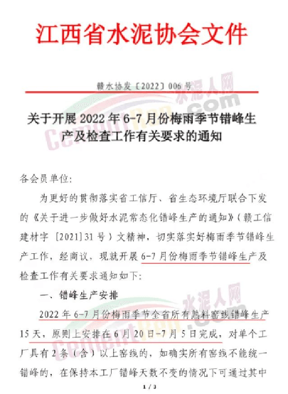 江西省水泥協(xié)會也在近日發(fā)布關(guān)于開展2022年6-7月梅雨季節(jié)錯峰生產(chǎn)及檢查工作有關(guān)要求的通知,全省所有熟料窯線錯峰生產(chǎn)15天,對單一工廠具有2條(含)以上窯線的,如確實所有窯線不能統(tǒng)一錯峰,在保持本工廠錯峰天數(shù)不變的情況下可通過其中的1條或2條窯線進行調(diào)節(jié)置換。計劃外停窯的不納入本次錯峰生產(chǎn)時間。