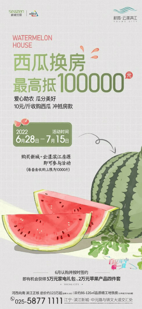 6 月 28 日,新城控股位于南京江寧的云漾濱江項(xiàng)目海報(bào)上赫然寫著 “ 西瓜換房最高抵 100000 元”,西瓜 10 元/斤,每套房收購(gòu)上限為 1 萬(wàn)斤。
