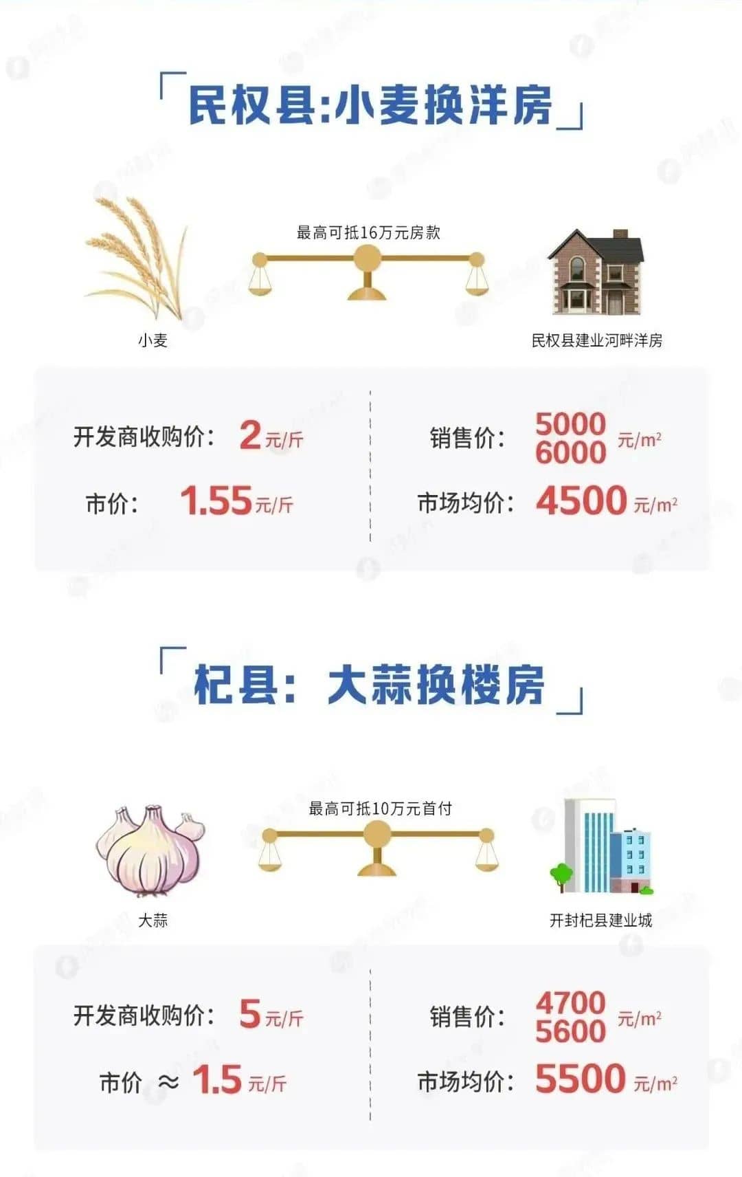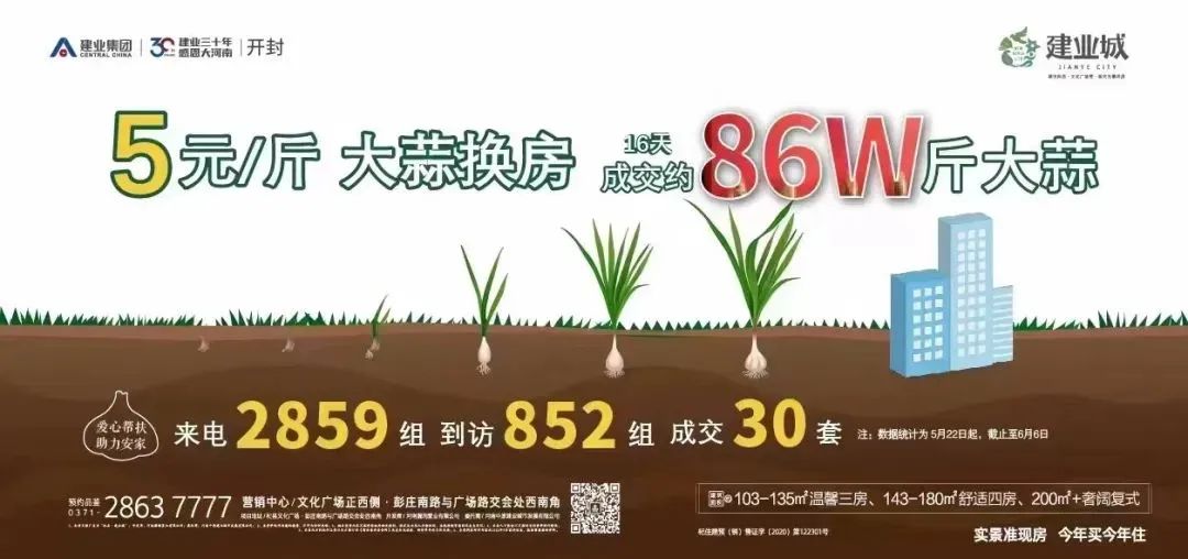 河南商丘民權(quán)縣建業(yè)地產(chǎn)的一個(gè)樓盤就以 “愛心助農(nóng)”的口號(hào),高價(jià)收高小麥抵首付,2元/斤,最高可抵 16萬(wàn)房款。建業(yè)地產(chǎn)在河南開封杞縣還推出了大蒜抵房款。