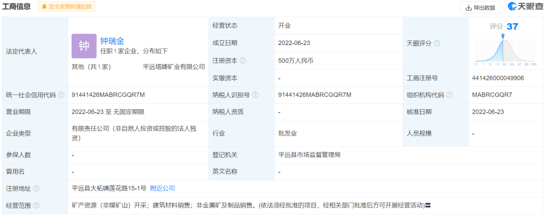 天眼查APP顯示,平遠塔牌礦業(yè)有限公司,于2022年6月23日成立,注冊資本為500萬人民幣,法定代表人為鐘瑞金,經(jīng)營狀態(tài)為開業(yè),工商注冊號為441426000049906,注冊地址為平遠縣大柘鎮(zhèn)蓮花路15-1號,經(jīng)營范圍包括礦產(chǎn)資源(非煤礦山)開采;建筑材料銷售;非金屬礦及制品銷售。