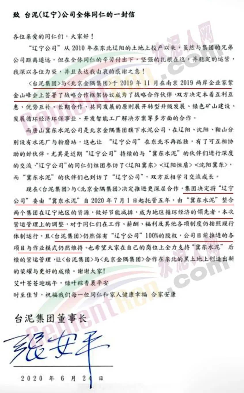 據(jù)水泥人網(wǎng)此前報道,2020年6月臺泥集團(tuán)董事長張安平先生在發(fā)給臺泥(遼寧)公司全體員工的一封公開信中稱:臺泥集團(tuán)與北京金隅集團(tuán)于2019年11月在“南京2019兩岸企業(yè)家紫金山峰會”上簽署了戰(zhàn)略合作框架協(xié)議,成為了戰(zhàn)略合作伙伴。