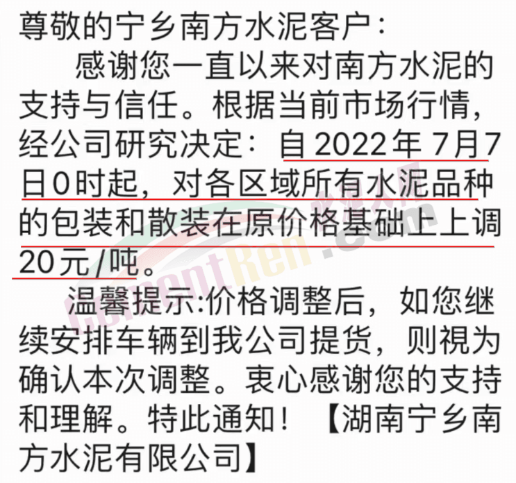 湖南寧鄉(xiāng)南方水泥有限公司通知,7月7日零時起,對各區(qū)域所有水泥品種的包裝和散裝在原價基礎(chǔ)上上調(diào)20元/噸。
