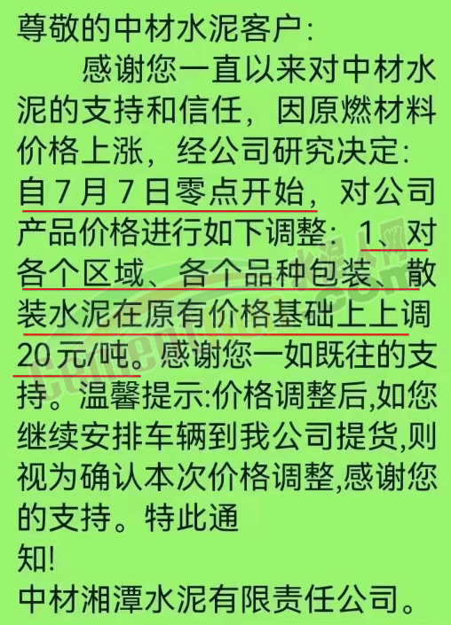 中材湘潭水泥有限責(zé)任公司通知,因原燃材料價格上漲,經(jīng)公司研究決定自7月7日零點(diǎn)開始,對各區(qū)域、各品牌包裝、散裝水泥在原價基礎(chǔ)上上調(diào)20元/噸。