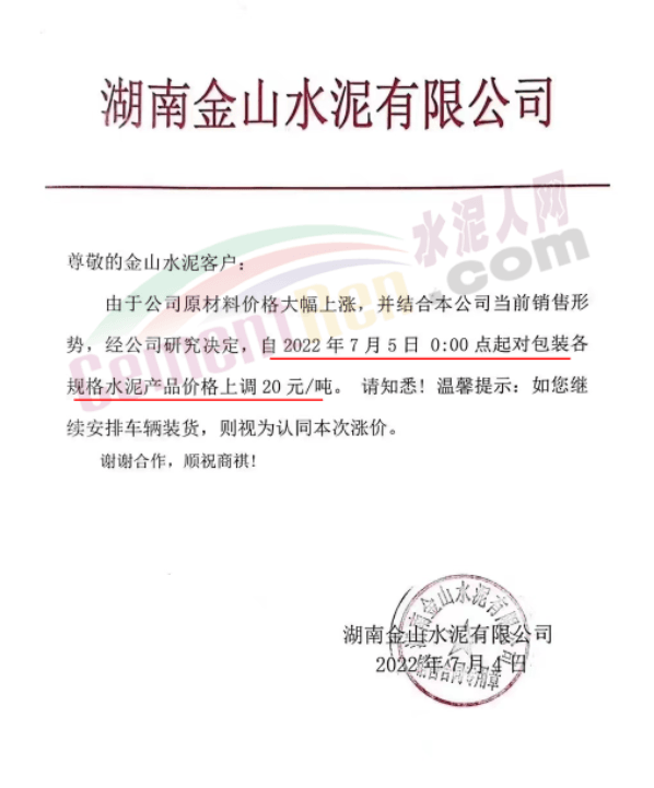 湖南金山水泥通知,由于公司原材料價格大幅上漲,結(jié)合公司當(dāng)前銷售形勢,經(jīng)公司研究決定,自7月5日0時起對包裝各規(guī)格水泥產(chǎn)品價格上調(diào)20元/噸。