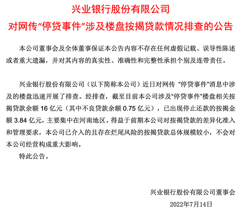 興業(yè)銀行發(fā)布公告稱,近日對(duì)網(wǎng)傳“停貸事件”消息中涉及的樓盤(pán)迅速開(kāi)展了排查。經(jīng)排查,截至目前,該行涉及“停貸事件”樓盤(pán)相關(guān)按揭貸款余額16億元(其中不良貸款余額0.75億元),已出現(xiàn)停止還款的按揭金額3.84億元,主要集中在河南地區(qū)。