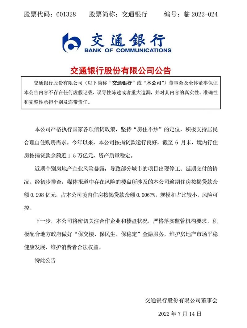交通銀行公告表示,該行嚴(yán)格執(zhí)行國(guó)家各項(xiàng)信貸政策,堅(jiān)持“房住不炒”的定位,積極支持居民合理自住購(gòu)房需求。今年以來(lái),該行按揭貸款運(yùn)行良好,截至6月末,境內(nèi)行住房按揭貸款余額近1.5萬(wàn)億元,資產(chǎn)質(zhì)量穩(wěn)定。
