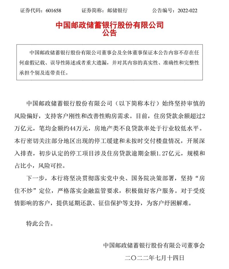 郵儲(chǔ)銀行:初步認(rèn)定停工項(xiàng)目涉及住房貸款逾期金額1.27億元