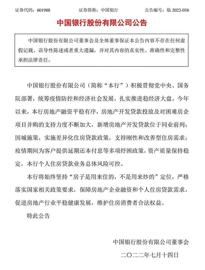 中國(guó)銀行公告稱,今年以來(lái),該行房地產(chǎn)融資平穩(wěn)有序,房地產(chǎn)開(kāi)發(fā)貸款投放及對(duì)困難房企項(xiàng)目并購(gòu)的支持力度不斷加大,新增房地產(chǎn)開(kāi)發(fā)貸款位于同業(yè)前列;因城施策,實(shí)施差異化住房貸款政策,支持剛性和改善型住房需求;疫情期間為客戶提供延期還本付息等多項(xiàng)紓困政策,資產(chǎn)質(zhì)量保持穩(wěn)定,該行個(gè)人住房貸款業(yè)務(wù)總體風(fēng)險(xiǎn)可控。