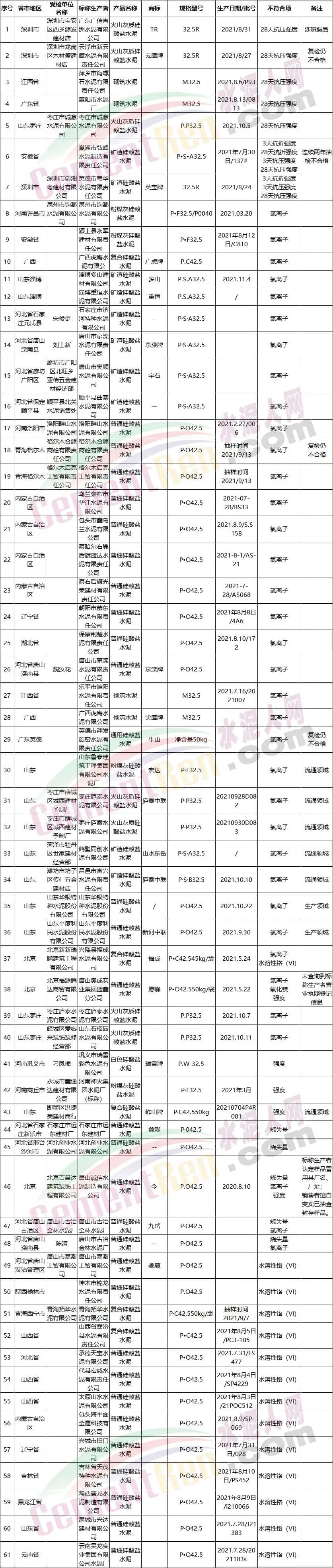 據(jù)不完全統(tǒng)計(jì),今年上半年以來,各區(qū)域通報(bào)的水泥產(chǎn)品質(zhì)量監(jiān)督抽查結(jié)果顯示,共有61批次水泥產(chǎn)品不合格,不合格項(xiàng)目涉及氧化鎂、燒失量、氯離子、抗壓、抗折強(qiáng)度、水溶性鉻(VI)等,不合格品不僅涉及低標(biāo)號水泥也包括部分高標(biāo)號水泥,不僅有包裝水泥也有個(gè)別企業(yè)的散裝水泥被通報(bào)不合格。