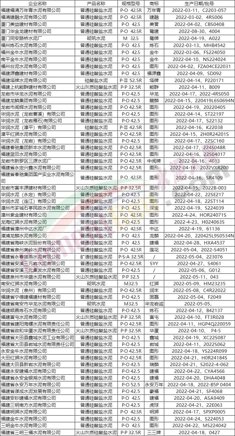 7月15日,福建省市場監(jiān)督管理局公布了《福建省市場監(jiān)督管理局工業(yè)產(chǎn)品-水泥質量省級監(jiān)督抽查結果公告(2022年第110期)》。