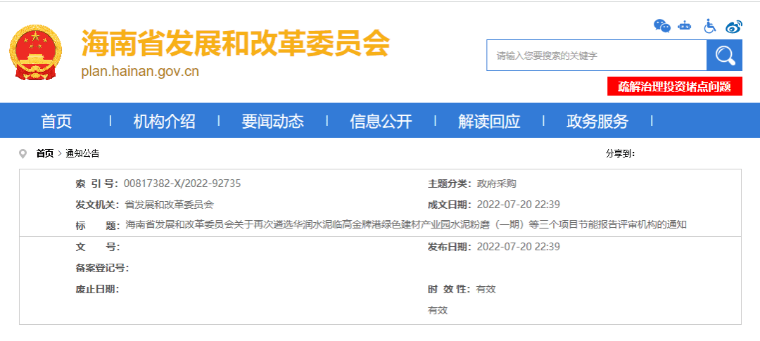 根據(jù)《海南省固定資產(chǎn)投資項(xiàng)目節(jié)能審查實(shí)施辦法》(瓊府〔2017〕47號(hào))等有關(guān)規(guī)定,我委擬公開(kāi)遴選1家評(píng)審機(jī)構(gòu)承擔(dān)華潤(rùn)水泥臨高金牌港綠色建材產(chǎn)業(yè)園水泥粉磨(一期)等三個(gè)項(xiàng)目節(jié)能報(bào)告評(píng)審工作?,F(xiàn)將有關(guān)事項(xiàng)通知如下: