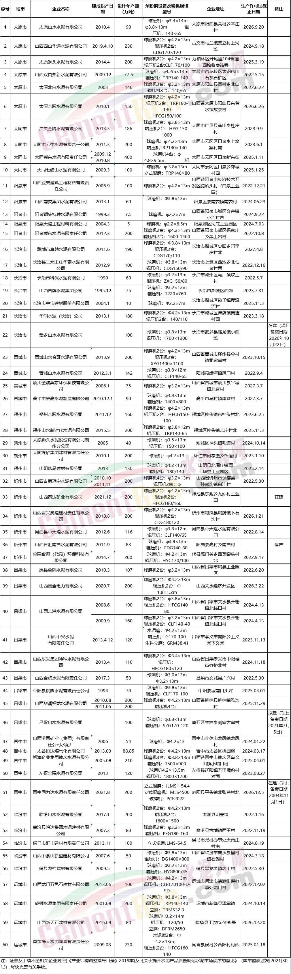 山西省水泥熟料生產(chǎn)線清單(截止2021年12月)