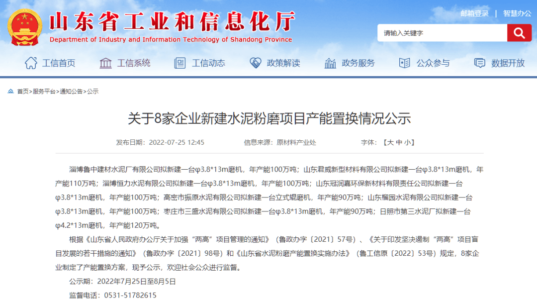 日前,山東省工信廳發(fā)布《關于8家企業(yè)新建水泥粉磨項目產(chǎn)能置換情況公示》稱,根據(jù)相關文件規(guī)定,8家企業(yè)制定了產(chǎn)能置換方案。置換比例全部為2:1,新建線產(chǎn)能規(guī)模為90~120萬噸/年,擬投產(chǎn)日期從2022年12月至2024年6月,合計產(chǎn)能達810萬噸/年,詳情如下: