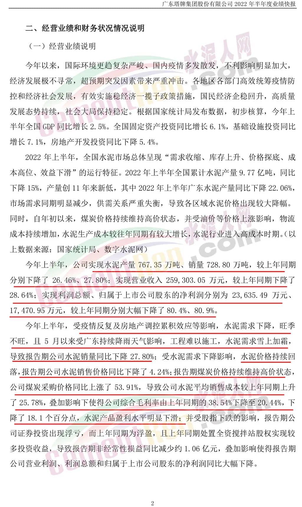 今年上半年,受疫情反復(fù)及房地產(chǎn)調(diào)控累積效應(yīng)等影響,水泥需求下降,旺季不旺,且5月以來受廣東持續(xù)降雨天氣影響,工程難以施工,水泥需求雪上加霜,導(dǎo)致報告期公司水泥銷量同比下降27.80%;受水泥需求下降影響,水泥價格持續(xù)回落,報告期公司水泥銷售價格同比下降了4.24%;報告期煤炭價格持續(xù)維持高價狀態(tài),導(dǎo)致公司水泥平均銷售成本較上年同期上升了25.78%。