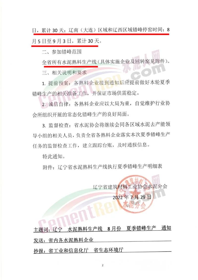 日前,遼寧省建筑材料工業(yè)協(xié)會水泥分會發(fā)布《關(guān)于遼寧省水泥熟料生產(chǎn)線8月份全面開展夏季錯峰生產(chǎn)的通知》給省內(nèi)各水泥熟料企業(yè)稱,依據(jù)相關(guān)文件要求,結(jié)合目前遼寧省乃至泛東北整個市場的供需情況,經(jīng)協(xié)會研究并征求省內(nèi)重點(diǎn)水泥企業(yè)(集團(tuán))達(dá)成共識,決定全省所有水泥熟料生產(chǎn)線8月份全面開展夏季錯峰生產(chǎn)。遼中區(qū)域及盤海營區(qū)域錯峰停窯時間:8月1日至30日,累計30天;遼南(大連)區(qū)域和遼西區(qū)域錯峰停窯時間:8月5日至9月3日,累計30天。