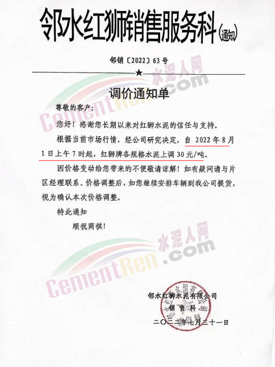 四川廣安鄰水紅獅水泥有限公司銷售科通知,根據(jù)當(dāng)前市場行情,經(jīng)公司研究決定,自8月1日上午7時起,紅獅牌各規(guī)格水泥上調(diào)30元/噸。