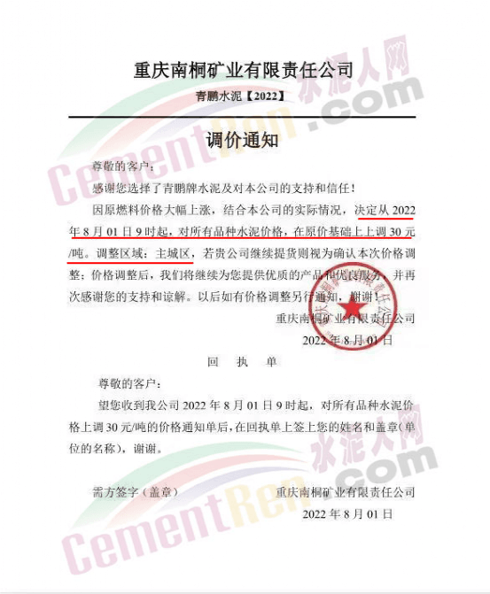 重慶南桐礦業(yè)有限責(zé)任公司通知,因原燃料價格大幅上漲,結(jié)合公司實際情況,決定從8月1日9時起,對發(fā)往重慶主城區(qū)所有品種水泥價格,在原價基礎(chǔ)上上調(diào)30元/噸。