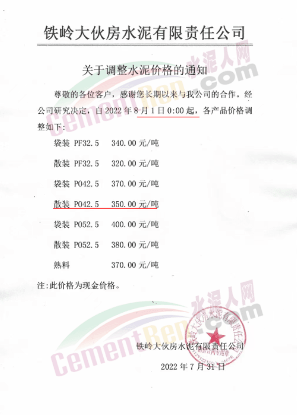 遼寧鐵嶺大伙房水泥有限責(zé)任公司通知,自8月1日0時起,調(diào)整水泥價格,調(diào)整后P.O42.5散裝水泥報價350元/噸。