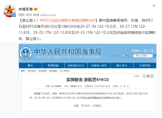 據中國海事局官網,東海,自8月3日至8月5日每天6時30分至18時30分在29-27.1N 122-10.23E、29-27.13N 122-13.83E、29-25.17N 122-13.83E及29-25.15N 122-10.23E四點連線間海域進行實彈射擊,禁止駛入。