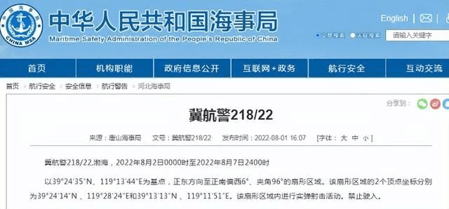 據唐山海事局發(fā)布的消息:冀航警218/22,渤海,2022年8月2日0000時至2022年8月7日2400時,以39°24′35″N、119°13′44″E為基點,正東方向至正南偏西6°、夾角96°的扇形區(qū)域。該扇形區(qū)域的2個頂點坐標分別為39°24′14″N、119°28′24″E和39°13′13″N、119°11′51″E。該扇形區(qū)域內進行實彈射擊活動,禁止駛入。