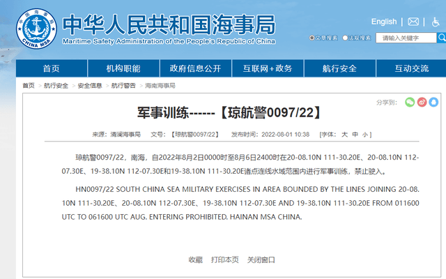 據清瀾海事局發(fā)布的消息:瓊航警0097/22,南海,自2022年8月2日0000時至8月6日2400時在20-08.10N 111-30.20E、20-08.10N 112-07.30E、19-38.10N 112-07.30E和19-38.10N 111-30.20E諸點連線水域范圍內進行軍事訓練,禁止駛入。