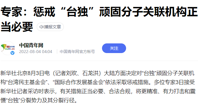 也就是說,無論是經濟還是軍事,多個領域的反制都會帶來嚴重的影響,且力度大小取決于后續(xù)的事態(tài)發(fā)展。國臺辦發(fā)言人馬曉光也表態(tài),我們采取必要措施反制是維護主權和領土完整的應有之義、正當之舉。我們敦促有關組織和個人,停止混淆是非、顛倒黑白,停止為“臺獨”勢力和任何干涉他國內政的人辯解,用實際行動恪守在臺灣問題上作出的嚴肅承諾,恪守一個中國原則,停止任何干涉中國內政和挑釁中國主權和領土完整的行徑。