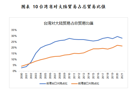 在經濟領域,從臺灣省和大陸的進出口貿易比值來看,臺灣省對大陸進出口貿易占比呈現逐漸上升走勢,且臺灣省與大陸貿易聯系日漸緊密。2021年臺灣省出口大陸地區(qū)貨品金額為1259億美元,占臺灣省總出口金額28.2%;臺灣省進口大陸地區(qū)貨品金額為825億美元,占臺灣省總金額21.6%。