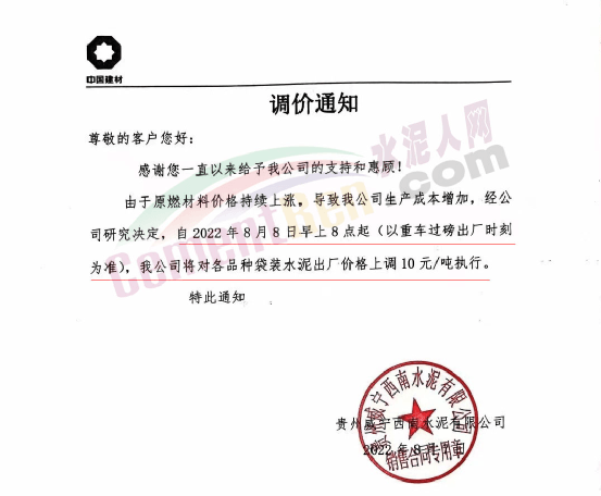 同期,大方永貴建材有限責(zé)任公司通知,自8月8日是零點(diǎn)起,對所有品牌出廠價按上調(diào)10元/噸執(zhí)行。
