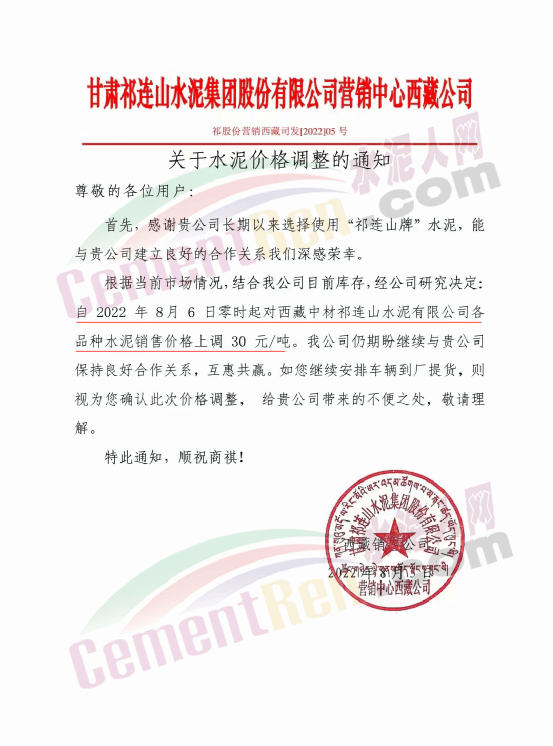 日前祁連山水泥集團(tuán)西藏公司通知,根據(jù)當(dāng)前市場情況,結(jié)合公司目前庫存,經(jīng)公司研究決定自8月6日零時起對西藏中材祁連山水泥有限公司各品種水泥銷售價格上調(diào)30元/噸。調(diào)價后如繼續(xù)安排車輛到廠提貨,則視為確認(rèn)本次調(diào)價。