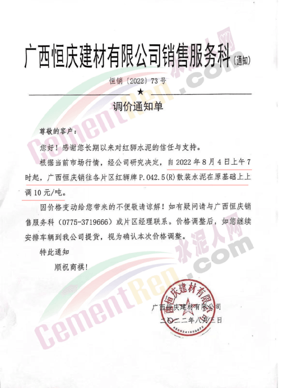 廣西恒慶建材有限公司日前通知,紅獅水泥價格自8月4日起上調(diào)10元/噸。企業(yè)負(fù)責(zé)人表示,下半年以工程市場為主,民建市場為輔。