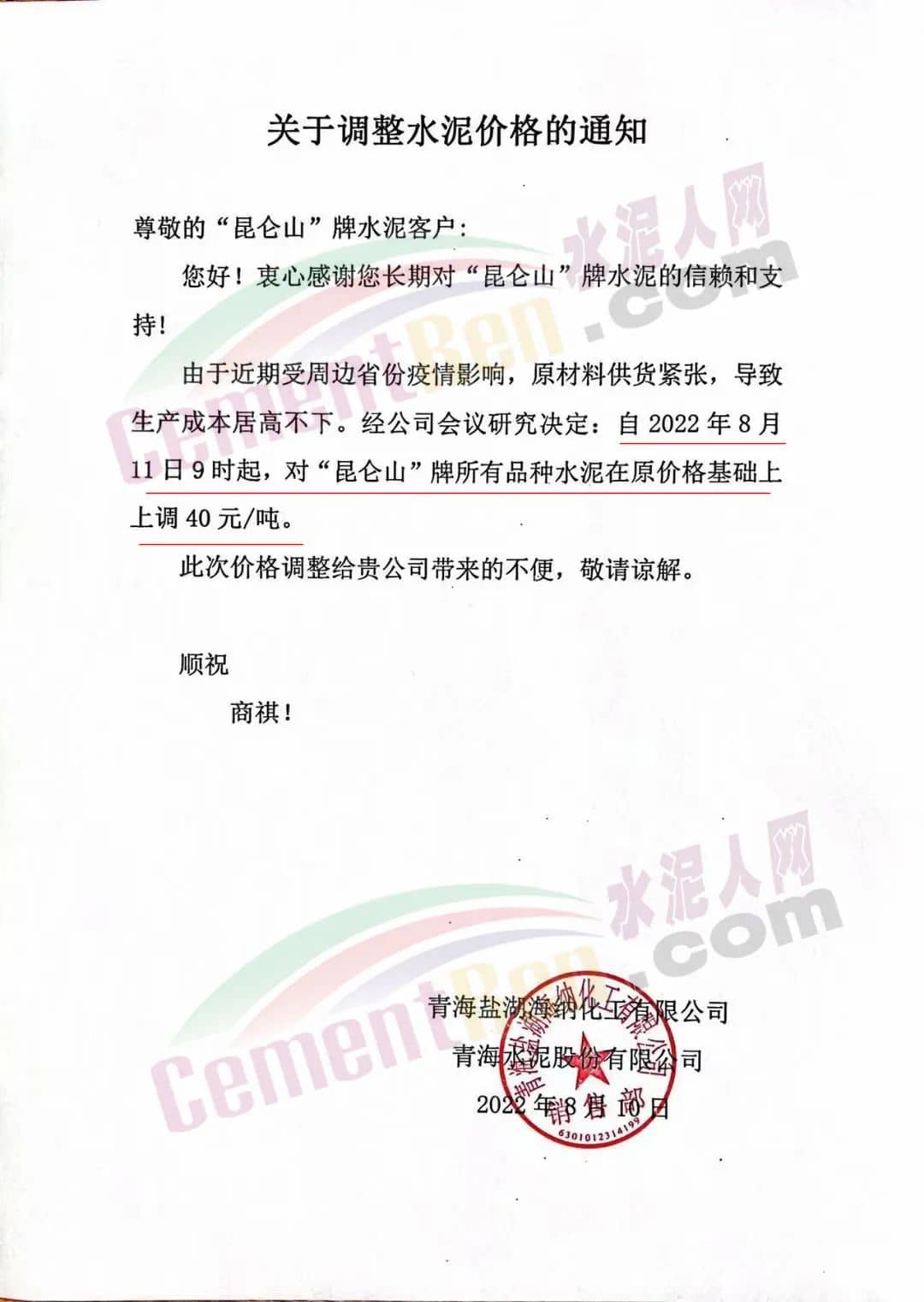 水泥人網(wǎng)通訊員消息,繼前期二十多個(gè)地區(qū)水泥價(jià)格調(diào)后,近幾日又有企業(yè)跟隨通知上調(diào)水泥價(jià)格。青海鹽湖海納化工有限公司青海水泥股份有限公司銷售部通知,由于近期受周邊省份疫情影響,原材料供貨緊張,導(dǎo)致生產(chǎn)成本居高不下,經(jīng)公司會(huì)議決定自8月11日9時(shí)起,對(duì)“昆侖山”牌所有品種水泥在原價(jià)基礎(chǔ)上上調(diào)40元/噸。