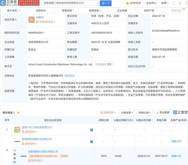 據(jù)查詢(xún),集團(tuán)集團(tuán)旗下近日還新增了一家名為安徽海螺工程機(jī)械科技有限責(zé)任公司的企業(yè),法定代表人為段要傳,成立日期為2022年7月18日,注冊(cè)資本4000萬(wàn)元人民幣,經(jīng)營(yíng)范圍包含:汽車(chē)零部件研發(fā);農(nóng)林牧副漁業(yè)專(zhuān)業(yè)機(jī)械的安裝、維修;氣壓動(dòng)力機(jī)械及元件銷(xiāo)售;礦山機(jī)械銷(xiāo)售等。企查查股權(quán)穿透顯示,該公司由海螺水泥全資子公司安徽銅陵海螺水泥有限公司等共同持股。