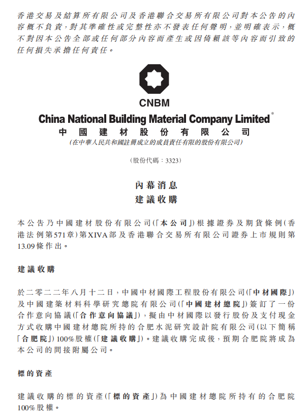中國建材上市公司發(fā)布公告稱,于2022年8月12日,中國中材國際工程股份有限公司(「中材國際」)及中國建筑材料科學研究總院有限公司(「中國建材總院」)簽訂了一份合作意向協(xié)議(「合作意向協(xié)議」),擬由中材國際以發(fā)行股份及支付現(xiàn)金方式收購中國建材總院所持的合肥水泥研究設(shè)計院有限公司(以下簡稱「合肥院」)100%股權(quán)(「建議收購」)。建議收購?fù)瓿珊?,預(yù)期合肥院將成為本公司的間接附屬公司。