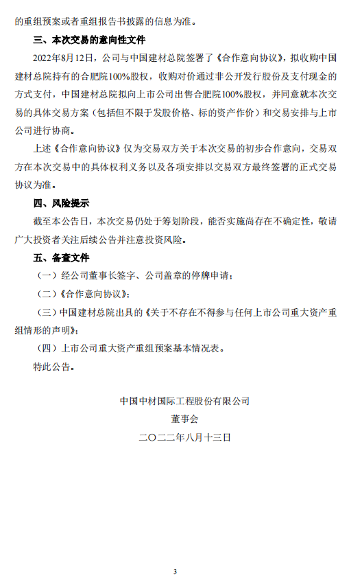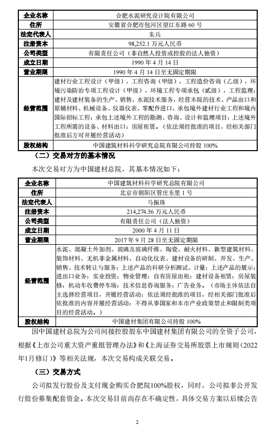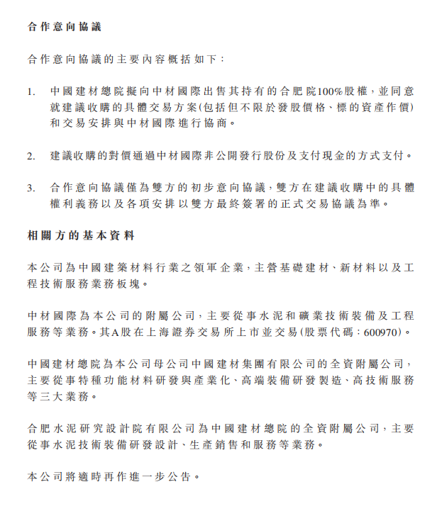 1.中國建材總院擬向中材國際出售其持有的合肥院100%股權(quán),并同意就建議收購的具體交易方案(包括但不限于發(fā)股價格、標的資產(chǎn)作價)和交易安排與中材國際進行協(xié)商。