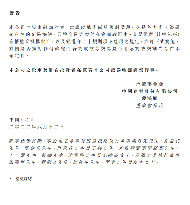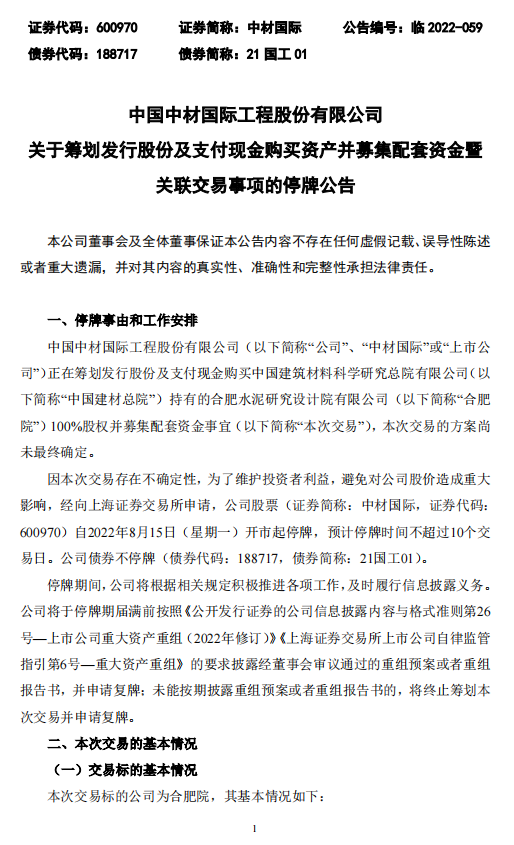 中材國際表示,本次交易存在不確定性,為維護投資者利益,避免對公司股價造成重大影響,公司股票自8月15日(星期一)開市起停牌,預(yù)計停牌時間不超過10個交易日。
