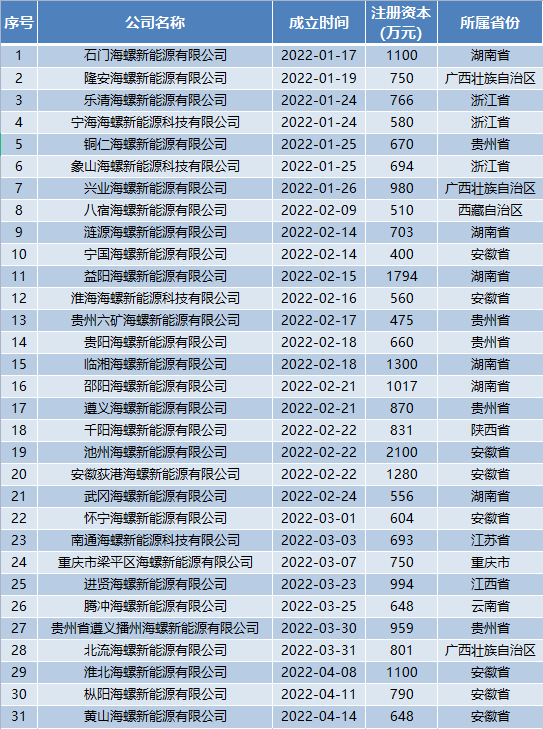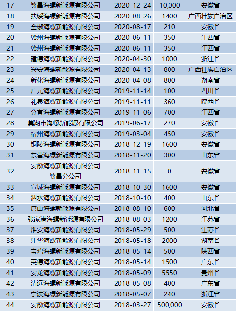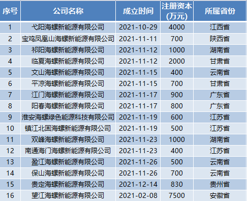 2018年-2021年,海螺新能源獨(dú)立出資設(shè)立了44家新能源公司。海螺新能源主營業(yè)務(wù)包括光伏發(fā)電、風(fēng)力發(fā)電、儲(chǔ)能系統(tǒng)領(lǐng)域內(nèi)的技術(shù)開發(fā)、技術(shù)服務(wù),電力項(xiàng)目的建設(shè)、運(yùn)營和管理等。