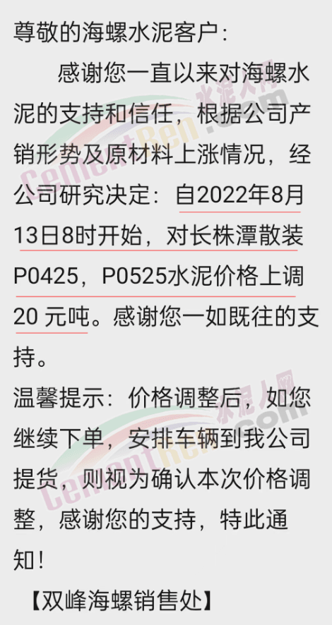 水泥人網(wǎng)通訊員消息:日前,雙峰海螺銷售處通知,根據(jù)公司產(chǎn)銷形勢及原材料上漲情況,經(jīng)公司研究決定自8月13日8時開始對長株潭散裝P.O42.5,P.O52.5水泥價格上調(diào)20元/噸。價格調(diào)整后,如繼續(xù)下單,安排車輛到公司提貨,則視為確認(rèn)本次價格調(diào)整。